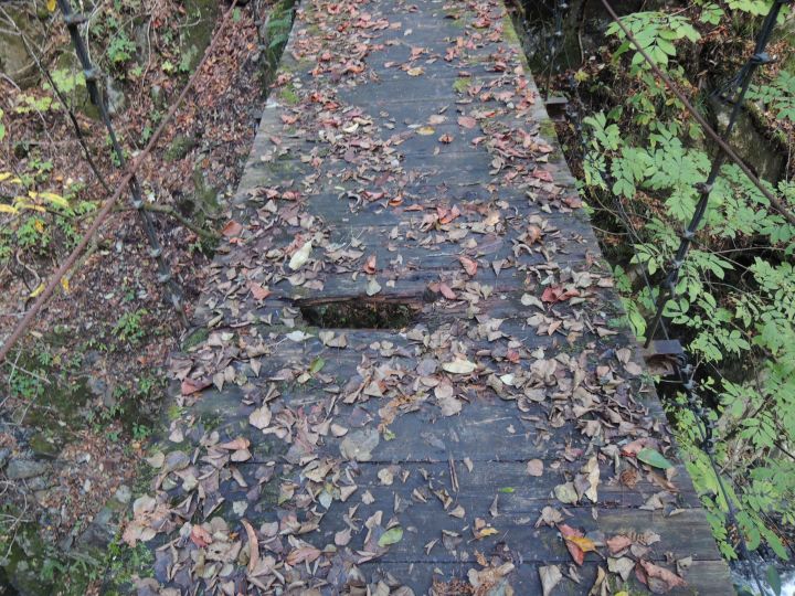橋の真ん中あたりの敷板に穴が開いていた。板が腐って朽ちかけているようだった。