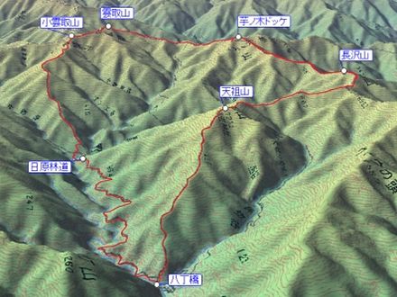 八丁橋 5:20 ⇒ 7:35 天祖山 7:45 ⇒ 梯子坂ノクビレ 8:10 ⇒ 長沢背稜分岐 8:45 ⇒ 長沢山 9:10 ⇒ 芋ノ木ドッケ 10:30 ⇒ 大ダワ 11:00 ⇒ 雲取山荘 11:20 ⇒ 11:50 雲取山 12:10 ⇒ 小雲取山 12:25 ⇒ 唐松谷林道分岐 13:40 ⇒ 日原林道 14:05 ⇒ 八丁橋 14:55