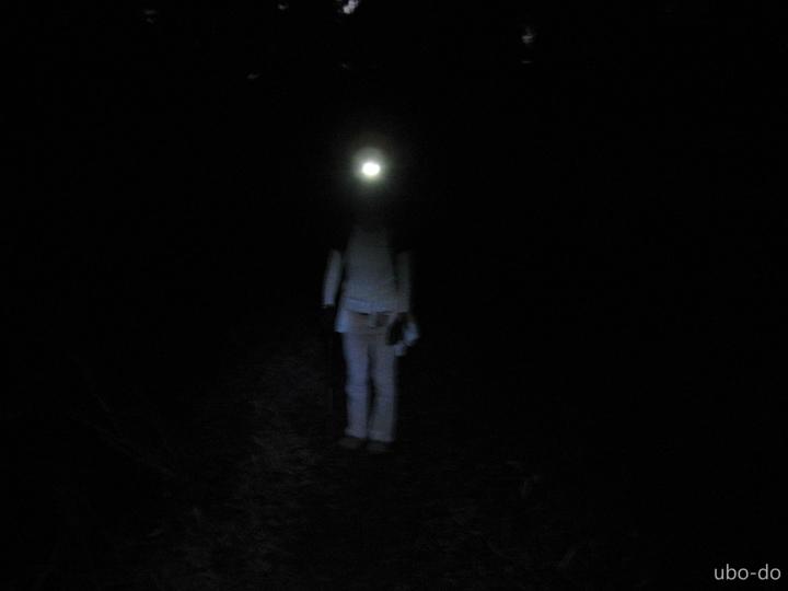 5:10 暗闇の中、ヘッドライトを頼りに歩く。視界が限られているので、小さな物音でもドキッとする。