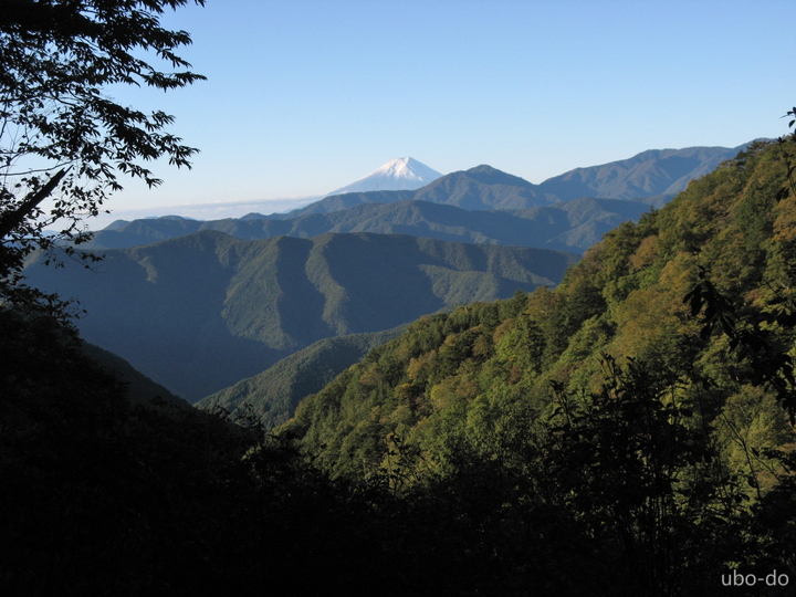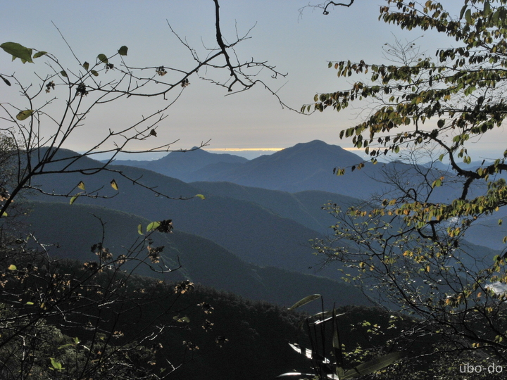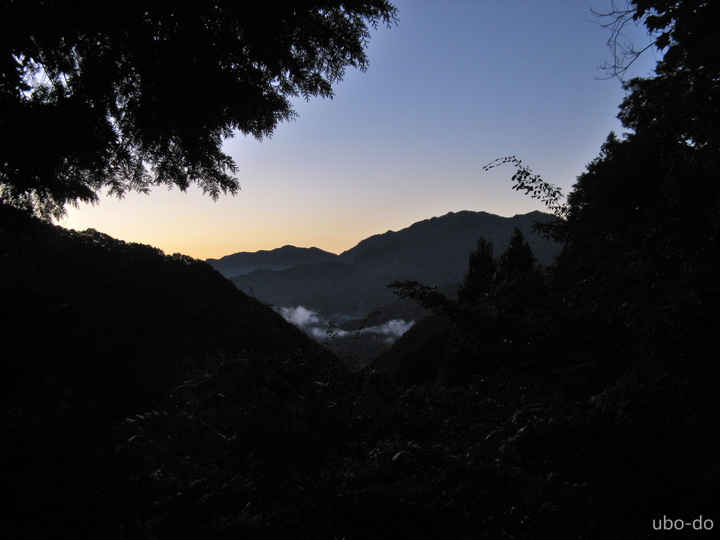 廃屋を何軒か過ぎて、スタートから30分もすると徐々に明るくなってきた。南の山間に三頭山の山陰が見えた。