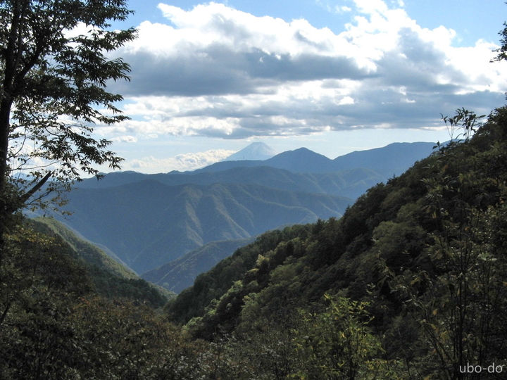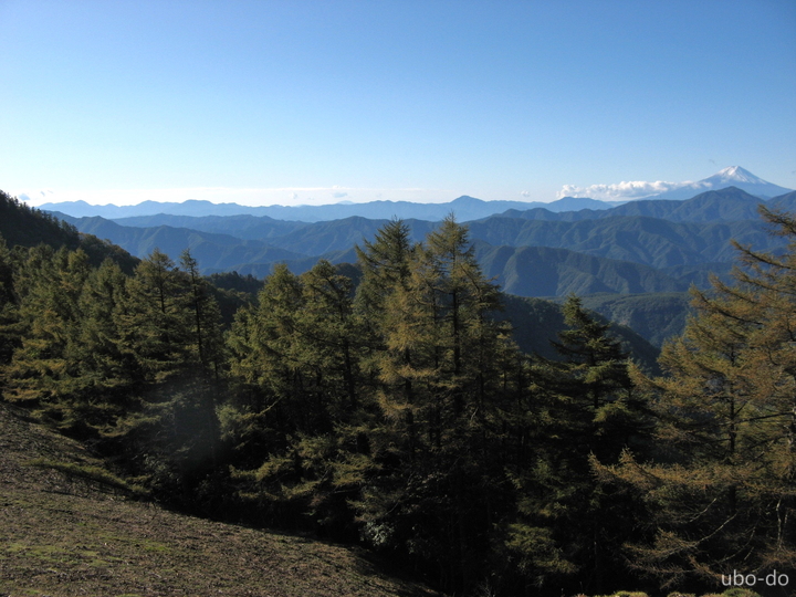 小雲取山の奥には三頭山、その向こうには大山から御正体山まで山並が続く。富士山には雲がかかっていた。