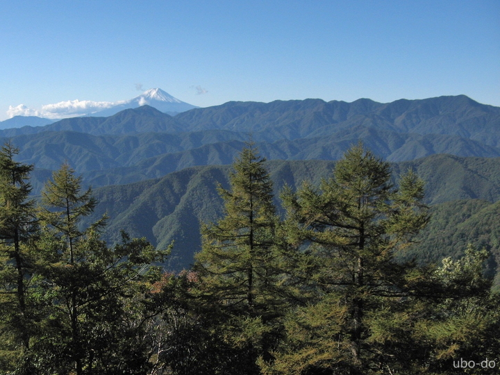 富士山の右には小金沢山と大菩薩嶺が並ぶ。富士山の手前は雁腹摺山(がんがはらすりやま)。