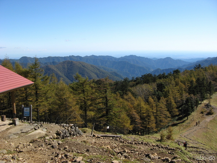 東側の眺め。いつの間にか周りに人が少なくなったが、登ってくるハイカーが稜線上に大勢見えた。