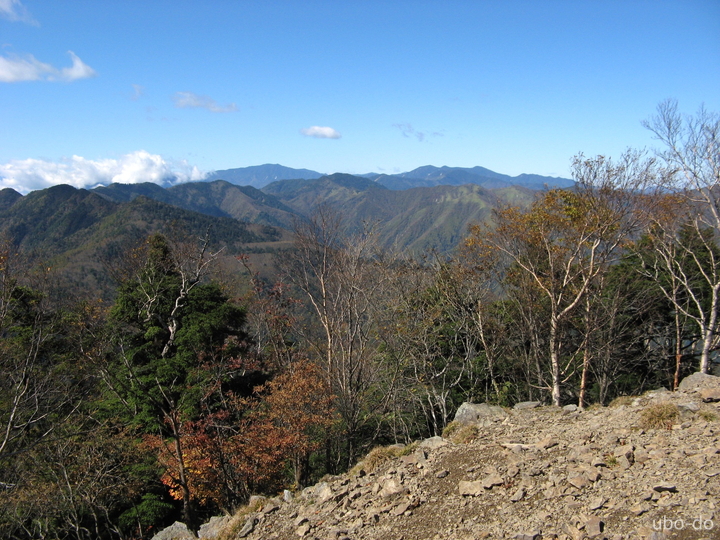 南東に小雲取山から続く稜線が延びている。左に川苔山、ほぼ中央に鷹巣山、その右奥に大岳山も見える。