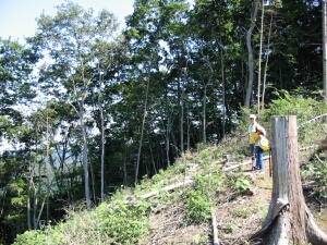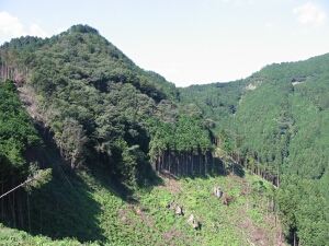 伐採で剥げた山から、さらに山腹を進んでいく。