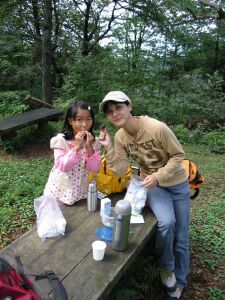 丸山展望台の下にあるベンチで昼食。デザートの葡萄を食べているところ。