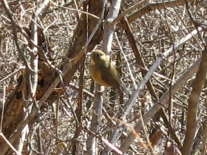 おかしな鳴き声が聞こえると思ったら、かわいい野鳥が現れた。ルリビタキの雌か、雄の若鳥のようだ。