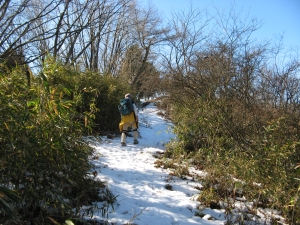 急な傾斜もしばらくすると緩やかになり、樹間から冠雪した八ヶ岳が見えた。
