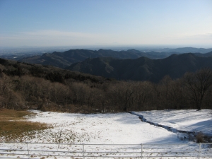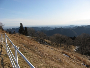 牧場前は西側の展望が抜群。うっすらと筑波山も見えた。登山道に入れないか探すが見つからなかった。