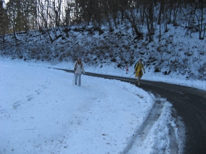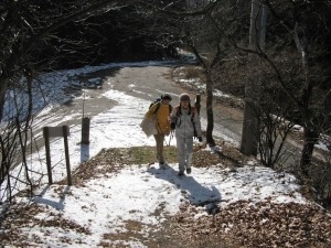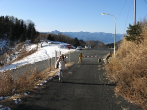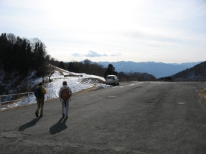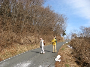 二本木峠まで林道を歩く。道路脇は積雪しており、ところどころ凍結していた。
