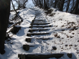 東側が開けた場所に出ると、手すりのある少し急な下りとなる。雪の足場がすべるので慎重に歩いた。
