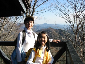 途中の見晴らし小屋にて。眺望は木々に遮られているが、東方面はよく見えた。背後は大岳山。