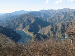 左から前飛龍山、飛龍山、中央に七ツ石山と雲取山、さらに高丸山、日陰名栗峰、鷹ノ巣山と続く。下は奥多摩湖。