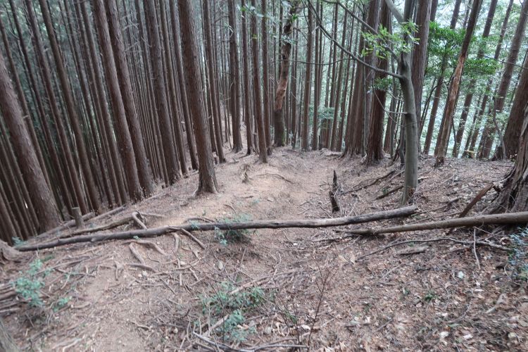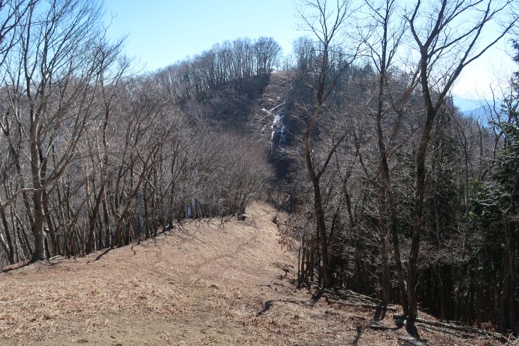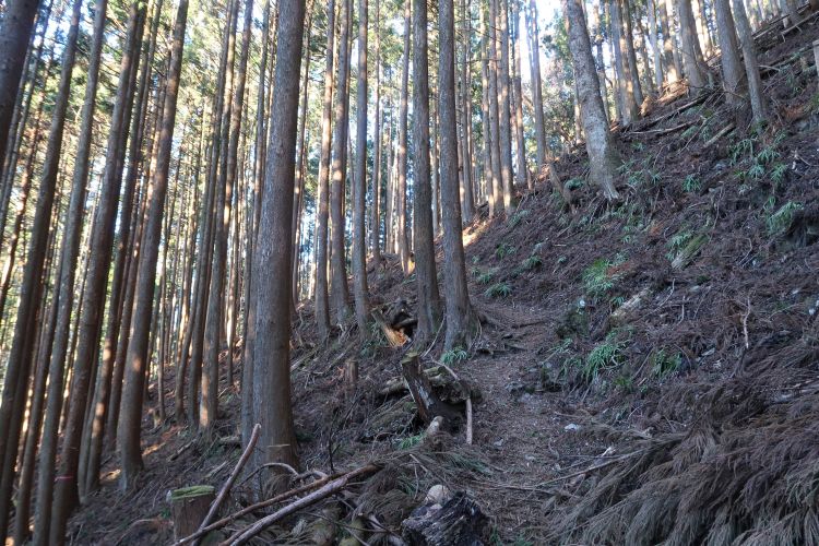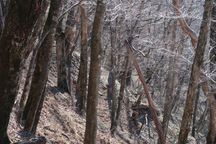 蕎麦粒山直下の急坂にさしかかった時、鋭い鳴き声とともにシカの群れが走り去るのが樹間に見えた。
