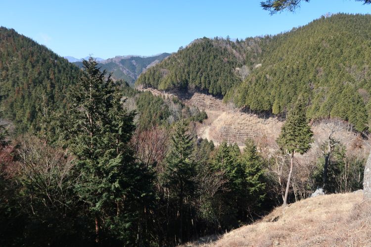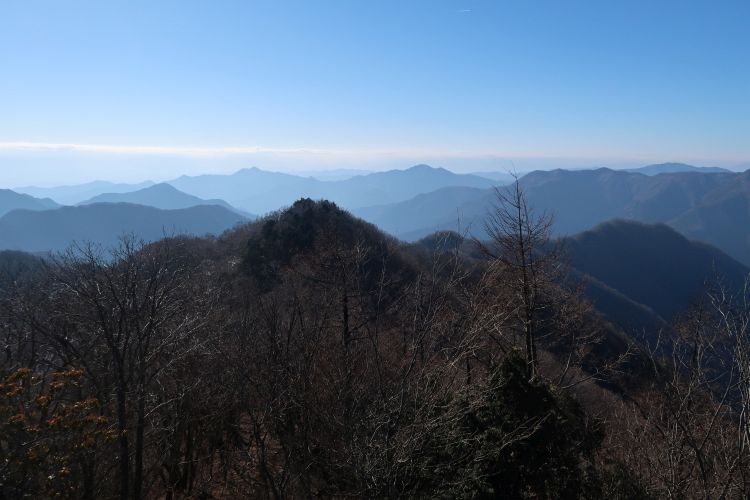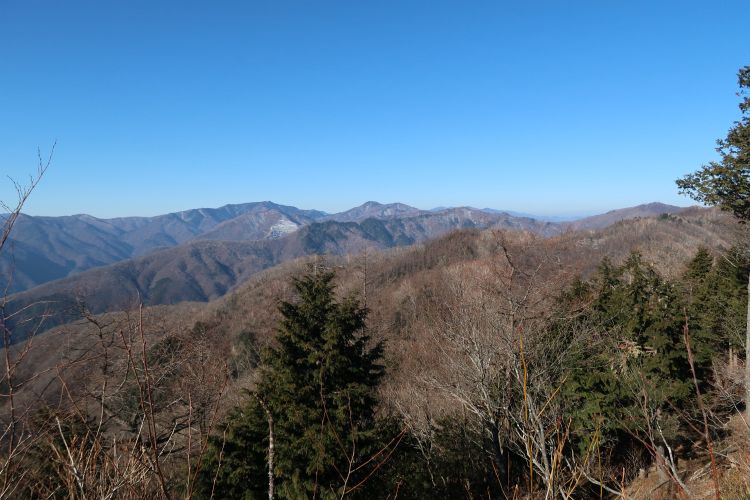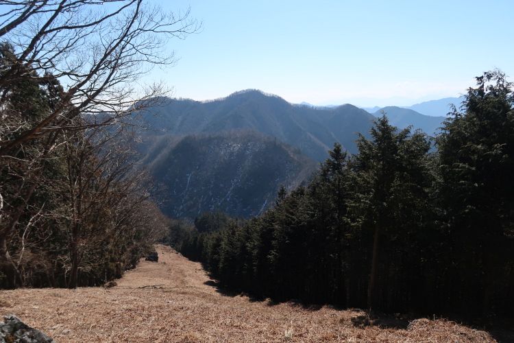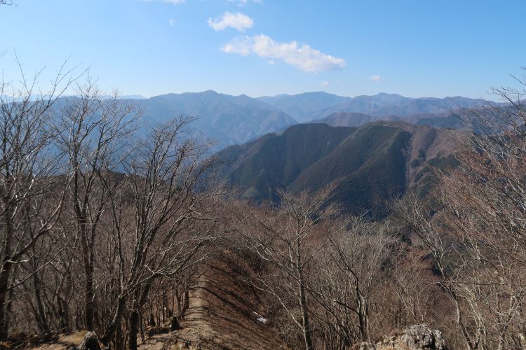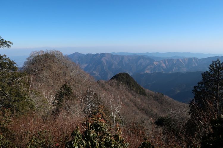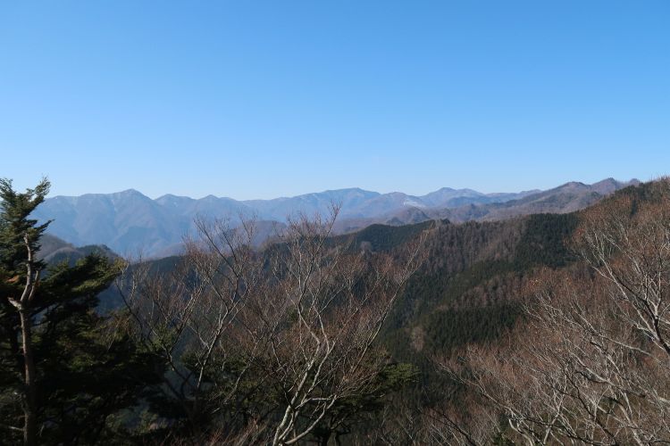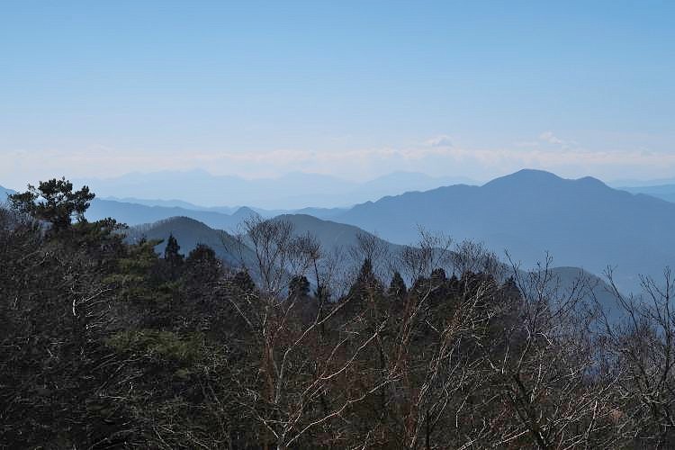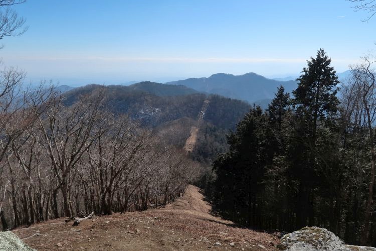 南側。左から本仁田山、大岳山、御前山、六ッ石山、三頭山。御前山の奥に見えるはずの丹沢山地は幽かに見える程度だった。