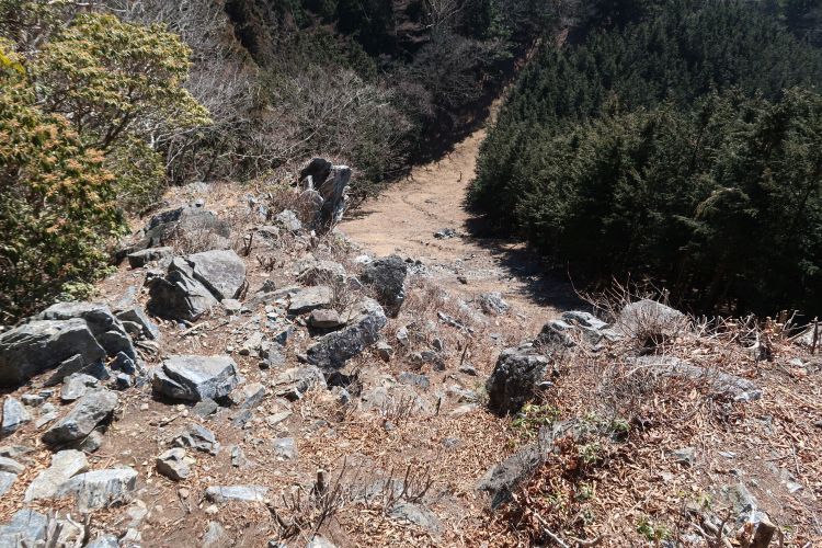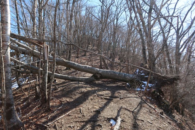 今回は登山道をふさぐように倒れた木を何度も目にした。積雪はほとんどなかったので、拍子抜けした。