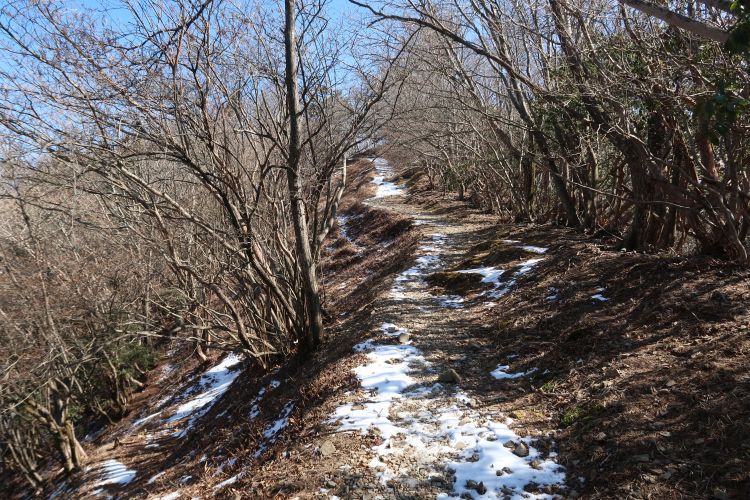 エビ小屋山への分岐を分けてどんどん下ると、ルートは雪の残る尾根の北側に入り、しばらく林道のような広い道が続いた。