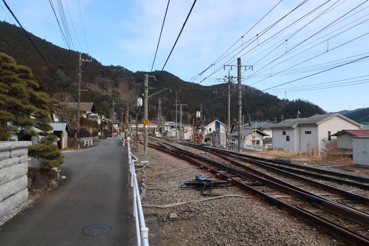 無人の古里駅は、遠目では分からないほど駅舎が小さくて、方角があっているか分からないまま線路沿いを進んだ。すると突然カンカンカンと電車の到来を知らせる警告音が鳴り出したので慌ててダッシュ。電車が入ると同時に駅舎に着いたが、券売機がどこにもない! システムが分からなくて混乱したが、簡易改札機にSuicaが通った。電車のドアが開いた時にはホームの反対側にいたが、跨線橋を走って何とか滑り込んだ。結局 14:55 の電車に乗り、10分ほどで終点の奥多摩駅に到着した。