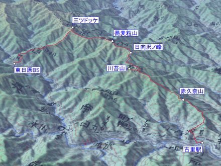 東日原BS 7:00 ⇒ 9:10 三ツドッケ 9:25 ⇒ 蕎麦粒山 10:30 ⇒ 11:05 日向沢ノ峰 11:25 ⇒ 12:35 川苔山 12:45 ⇒ 赤杭山 13:50 ⇒ 古里駅 14:55