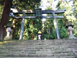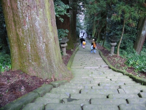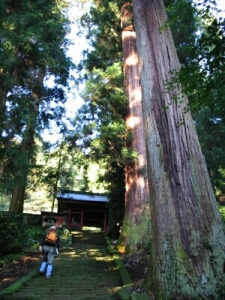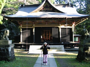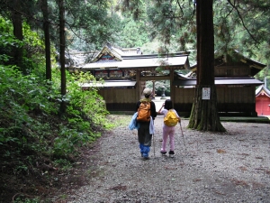 階段を上って、本殿の前で記念撮影。登山道は本殿を左に出たところにある。