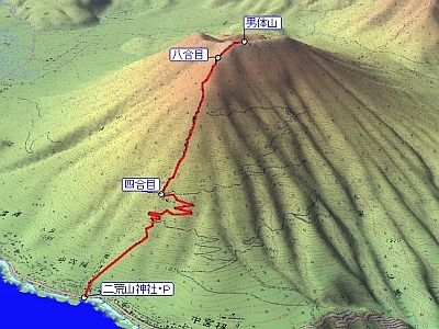 二荒山神社中宮祠 6:20 → 四合目 7:15 → 八合目 8:45 → 9:35 男体山山頂 12:10 → 八合目 12:35 → 四合目 13:25 → 二荒山神社中宮祠 14:00