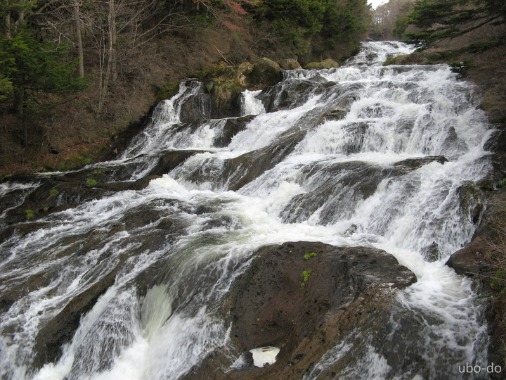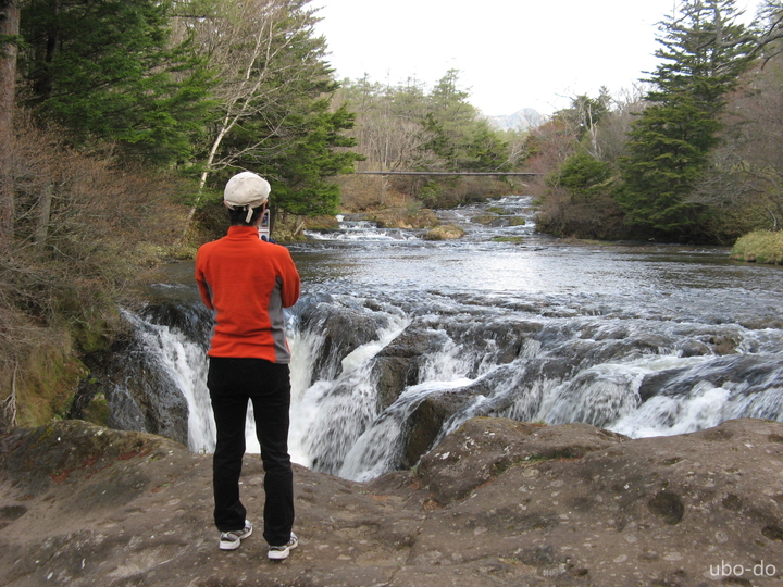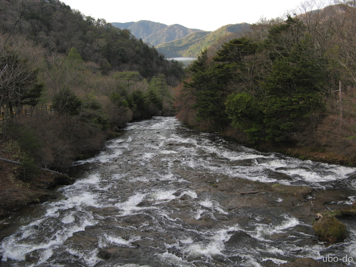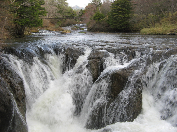 滝上の駐車場から上流にのびる遊歩道を歩いて、湯川を間近から眺めた。