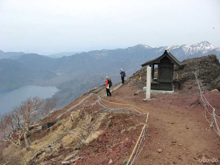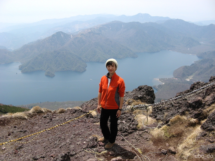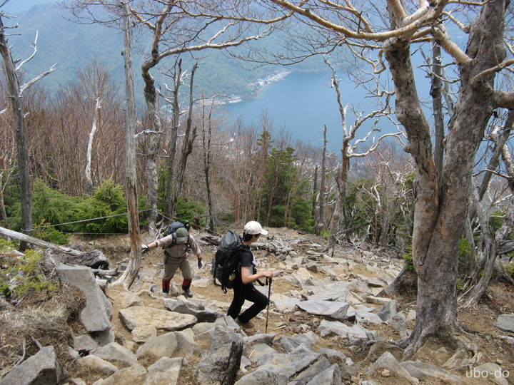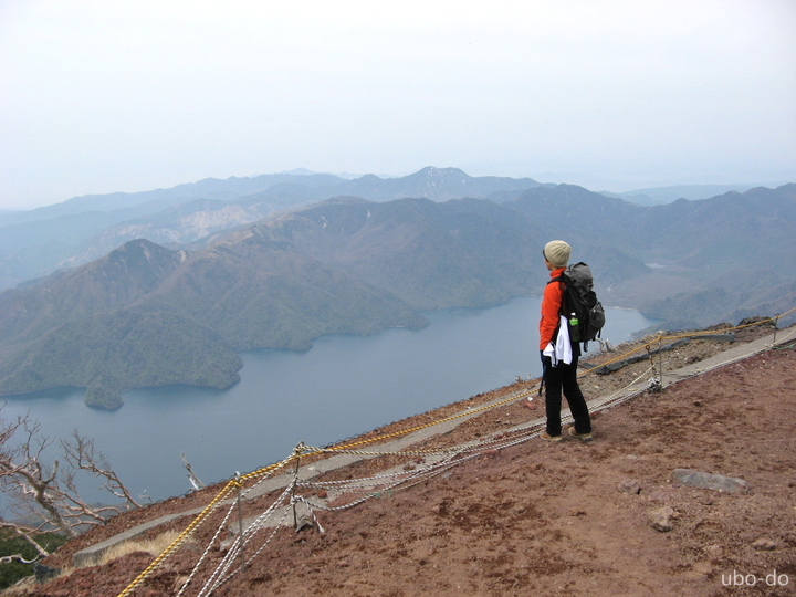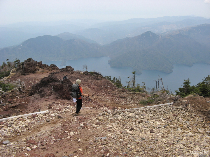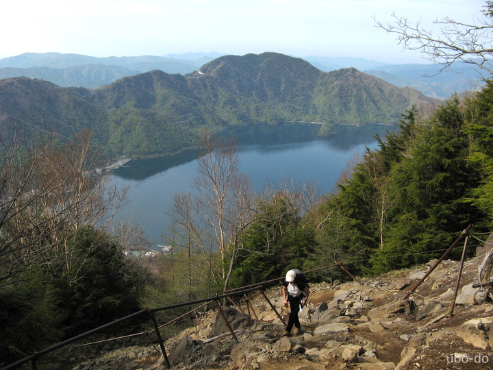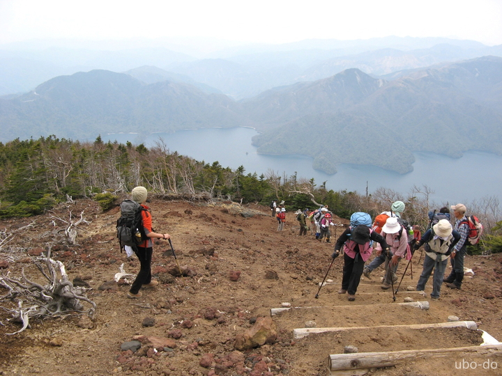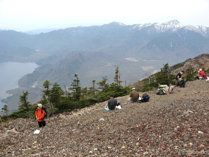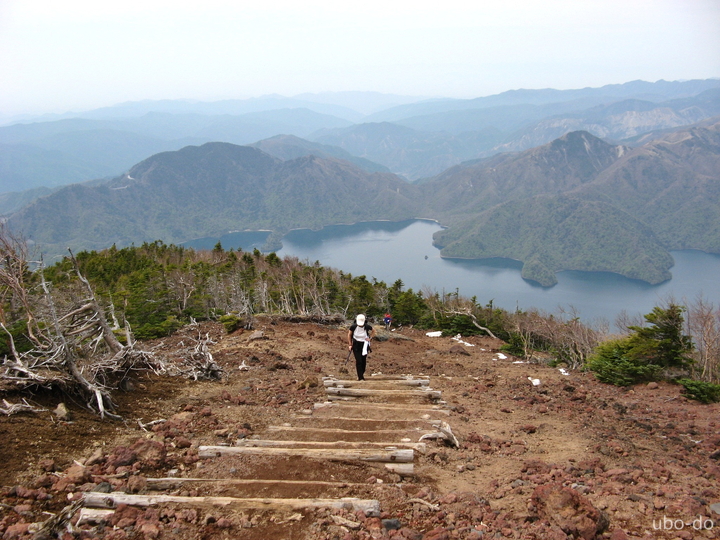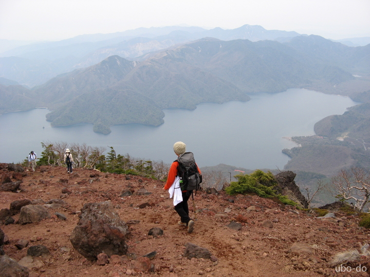次第に傾斜がきつくなった。小屋のある五合目あたりから中禅寺湖と対岸の山々が眼下に広がった。