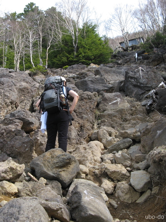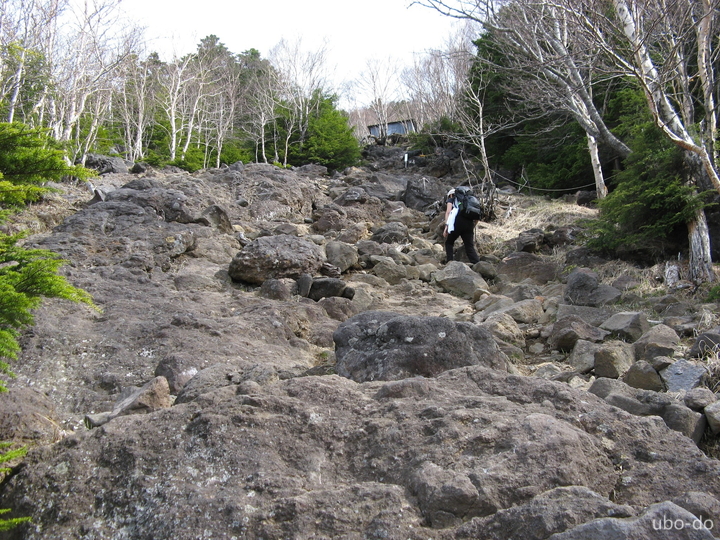 六合目付近から岩ゴロのガレ場が続く。