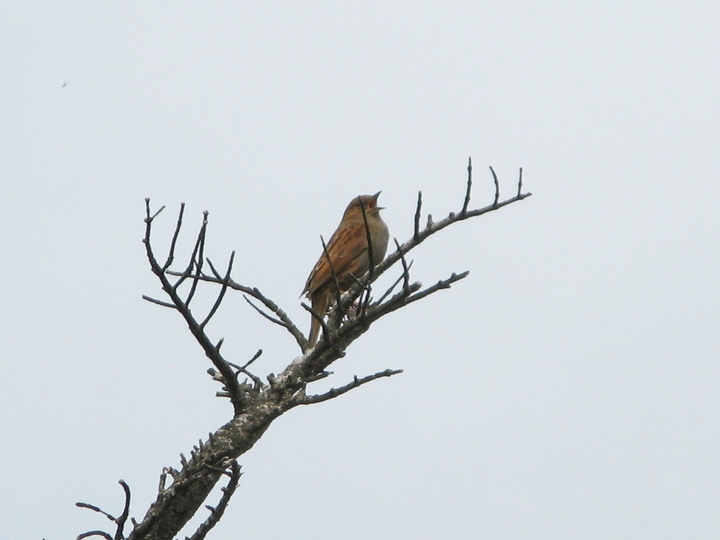 イワヒバリが枝に留まって啼いていた。早朝の青空は、完全に雲に覆われてしまった。