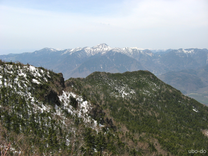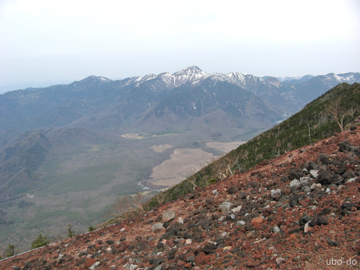 真ん中左に冠雪した至仏山。