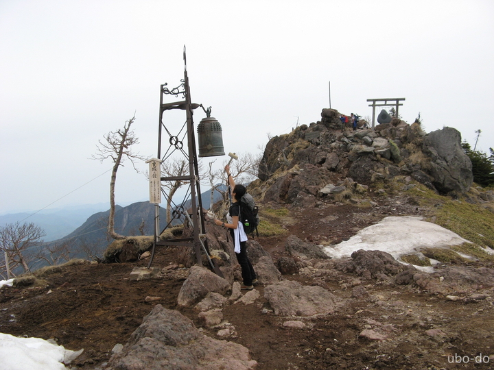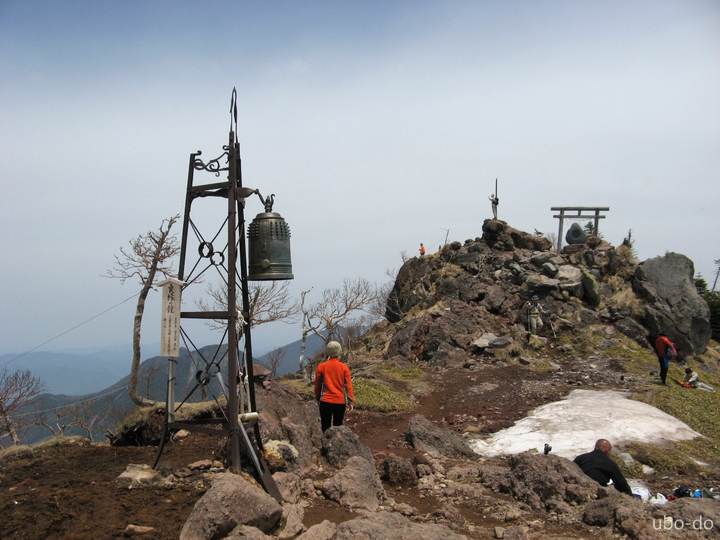 9:35 出発から3時間15分で山頂に到着した。「良縁の鐘」を鳴らしてから山頂の岩峰へ。