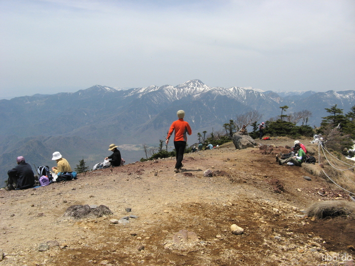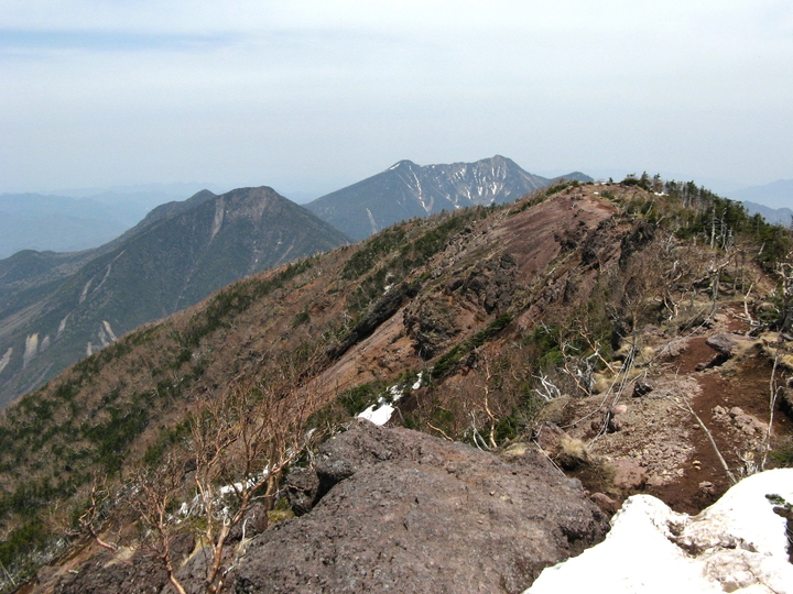西方面。中央に日光白根山、左は錫ヶ岳で、日光白根山の右には至仏山も見える。