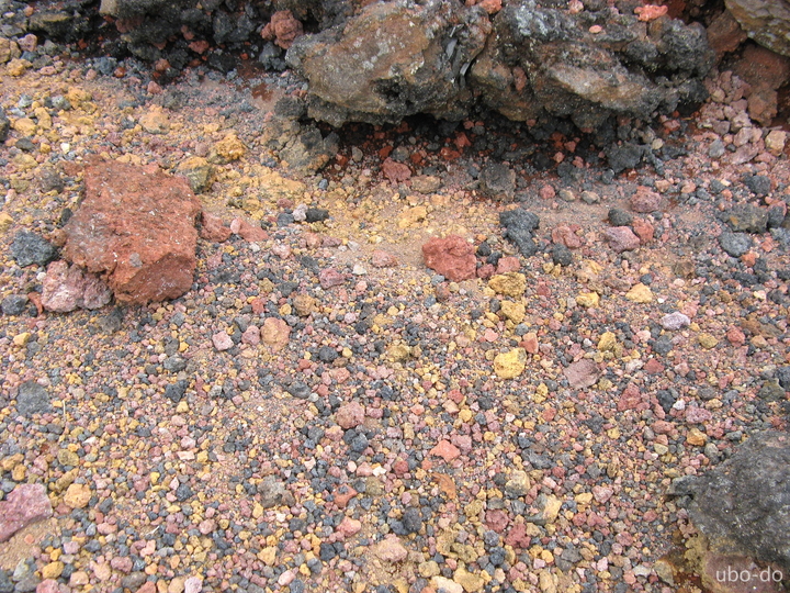 眺めを楽しみながら、火山岩がむき出しになった赤茶けた砂礫の斜面を上る。
