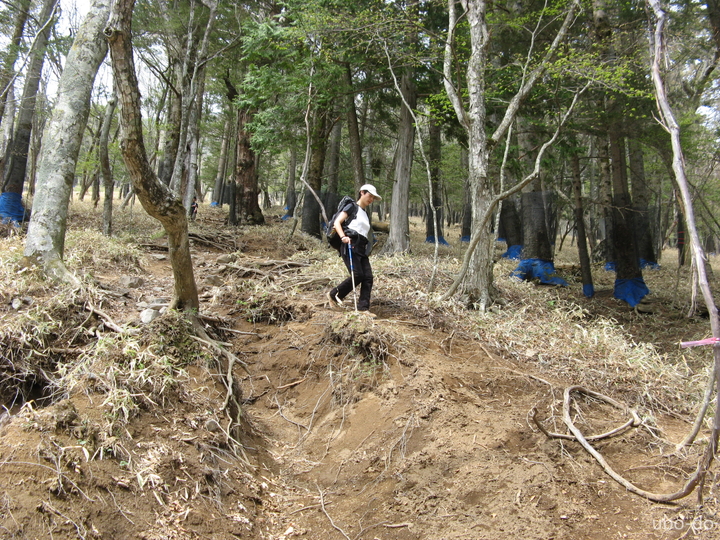 鹿除けネットが巻かれた樹林帯を上る。早朝から登山者の姿をちらほら見かけた。