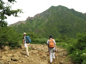 積雪の残る春先と違い、歩きやすくて危険はなかった。正面は朝日岳。