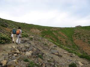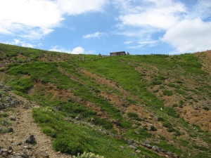 茶臼岳を見ながら剣ヶ峰の東側を巻いて行くと、峰の茶屋が見えてきた。