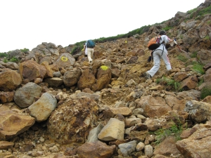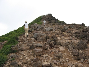 岩場を越えてガレた急坂を上ると朝日岳の西肩に出る。