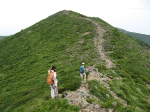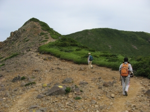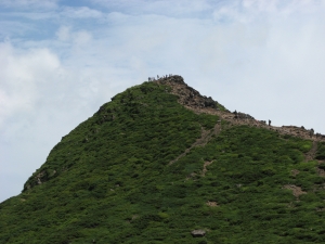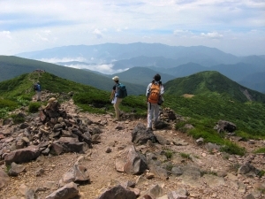 次は三本槍岳へ向かう。小峰の向こうに熊見曽根の尾根道を行くハイカーの姿が見えた。