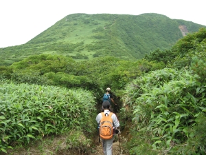 北温泉の分岐を過ぎると正面に三本槍岳が見える。背丈以上の灌木が続き、飛び回るスズメバチが怖かった。