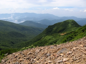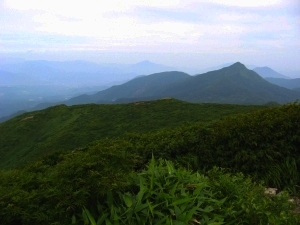 南方面。左にちょこんと朝日岳、中央は茶臼岳でその右奥に南月山、さらに右は白笹山。