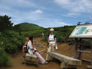 木や丸太の階段をしばらく歩くと視界が開けて、正面に朝日岳と剣ヶ峰が見えてくる。風はほとんどなかった。