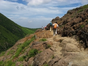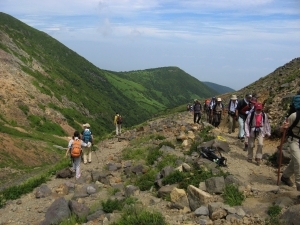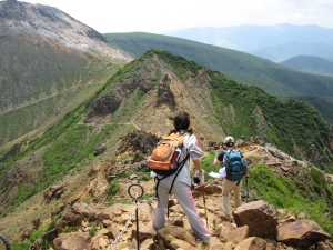 茶臼岳を南側に見ながら朝日岳と三本槍岳を登る本コースは、適度なスリルと雄大な展望に恵まれており、予想以上に楽しむことができた。人気の山なのでハイカーの数は多いが、谷川岳のように山道で数珠繋ぎになることもなく、奥行きのある眺望を楽しみながら快適に歩くことができる。三年前の前回は強風のために峰の茶屋まで行かずに撤退を余儀なくされたが、今回は風も穏やかで最高に楽しい山歩きとなった。
