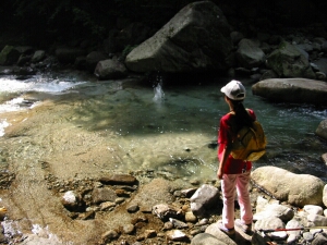 ときどき川岸に近づける箇所で遊びながら沢歩きを楽しむ。とにかく気持いい。