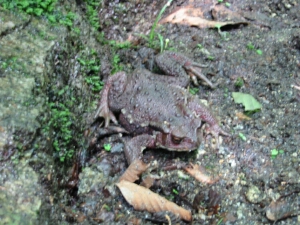 「カエル岩」の手前で、娘が本物の蛙を見つけた。突っつくと3回ほど跳んでピタッと動かなくなる。