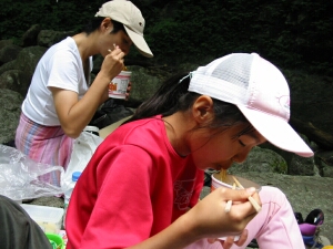 娘は川の水に触れたり、川に石を投げて遊んでいた。