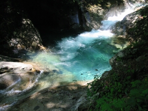 澄んだ川の水が緑に見えるのは、光の波長と光を反射する川底の花崗閃緑岩に原因があるらしい。