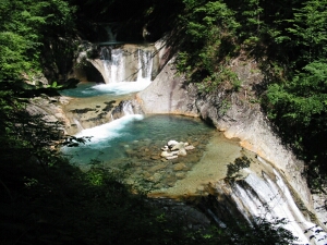 西沢渓谷を代表する「七ツ釜五段ノ滝」の下部。滝つぼで釣りをしている人がいた。