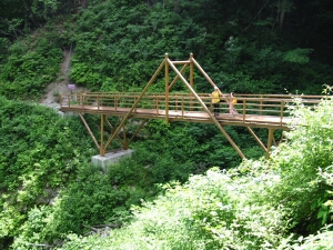 西沢別荘をすぎて1時間ほど歩くと、二股吊り橋がある。吊り橋だけあって、けっこう揺れる。