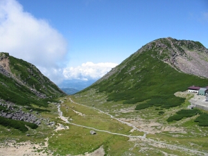 中央の大雪渓には僅かに雪が残っている。まだ歩き始めてまもないが、娘がごねるのでここで最初の休憩。