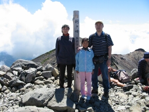 山頂で記念撮影。後ろのベテラン登山者2人組は、皆が写真を撮るスポットにずっと陣どっていた。休むスペースは他にもたくさんあったのだが…。